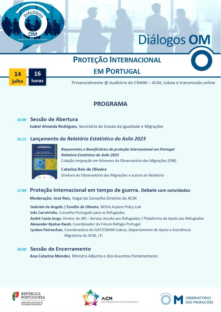 Nesta nova edição dos Diálogos OM, será lançado o “Relatório Estatístico do Asilo 2023 – Requerentes e Beneficiários de Proteção Internacional em Portugal”, da autoria de Catarina Reis Oliveira, Diretora do Observatórios das Migrações e coordenadora científica da Coleção Imigração em Números, num evento que contará com a presença da Secretária de Estado da Igualdade e Migrações, Isabel Almeida Rodrigues, e da Ministra Adjunta e dos Assuntos Parlamentares, Ana Catarina Mendes.