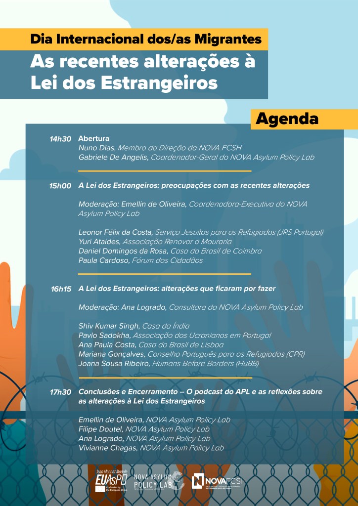 As part of the commemorations of International Migrants Day, the NOVA Asylum Policy Lab will host an afternoon of discussions bringing together academia and civil society. The event will take place on 18 December (Thursday) and aims to reflect on the recent amendments to the Foreigners’ Law, as well as to gather contributions on what still remains to be achieved in order to strengthen the promotion and protection of migrants’ rights in Portugal.
