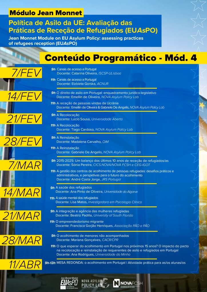 O Módulo 4: “Os desafios do acolhimento: os últimos 15 anos de políticas e práticas de receção de refugiados em Portugal”, decorrerá de 7 de fevereiro a 11 de abril de 2026, aos sábados, das 9h00 às 13h00 (exceto 4 de abril), e será realizado online, através da plataforma Zoom.