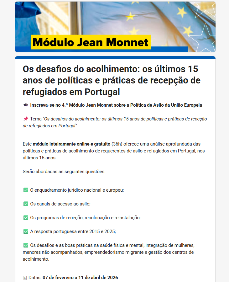 Inscreva-se para o Módulo 4 do Módulo Jean Monnet sobre a Política de Asilo da UE: Avaliação das Práticas de Receção de Refugiados (EUAsPO) [100% online e gratuito]. 🔍 Tema: “Os desafios do acolhimento: os últimos 15 anos de políticas e práticas de recepção de refugiados em Portugal” Este módulo online e gratuito de 36 horas…